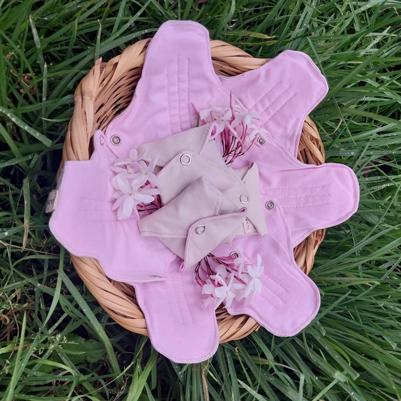 Toallas higiénicas femeninas reutilizables hechas de algodón pima bebé, para afianzar la conexión que tienes con tu cuerpo y tus flujos menstruales lunares, como un rito de cuidado y una revalorización del vínculo natural entre la Madre Tierra y tu propia matriz.